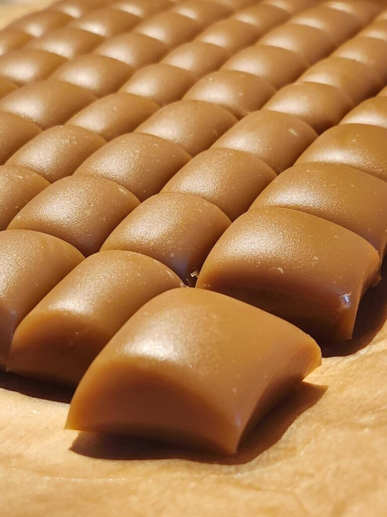 My favorite tool for cutting the caramels is a dough scraper, like this one from Amazon. Then I wrap them in parchment sheet squares. Store them in an airtight container for one to two weeks (if they last that long!)