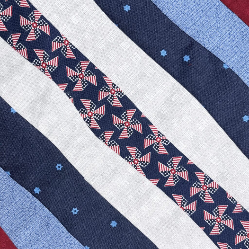 For Mississippi, I decided to do a block that would commemorate the river that bears its name. The Mississippi River headwaters start at Itasca State Park in central Minnesota, then winds it way, growing wider and deeper, south to the Gulf of Mexico. The River Run block is designed to remind us of the winding of the Mississippi River using a technique that is part improv and part curves.