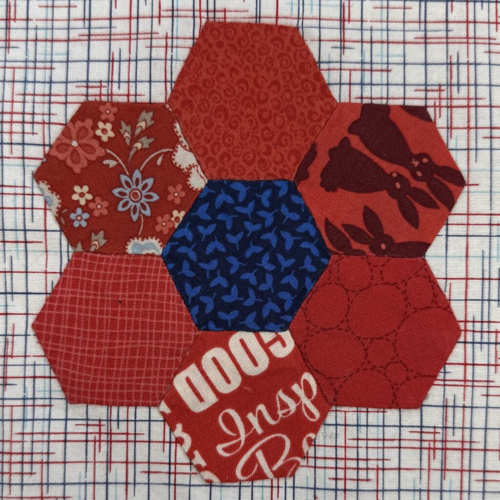 While searching for a block for South Carolina, I came across several different quilt museums in the state. what I noticed in each was the predominance of quilt made with the Grandmother’s Flower Garden block. This block gives a chance to work on a little English paper piecing, a new skill for the Quarter Millennial Quilt.