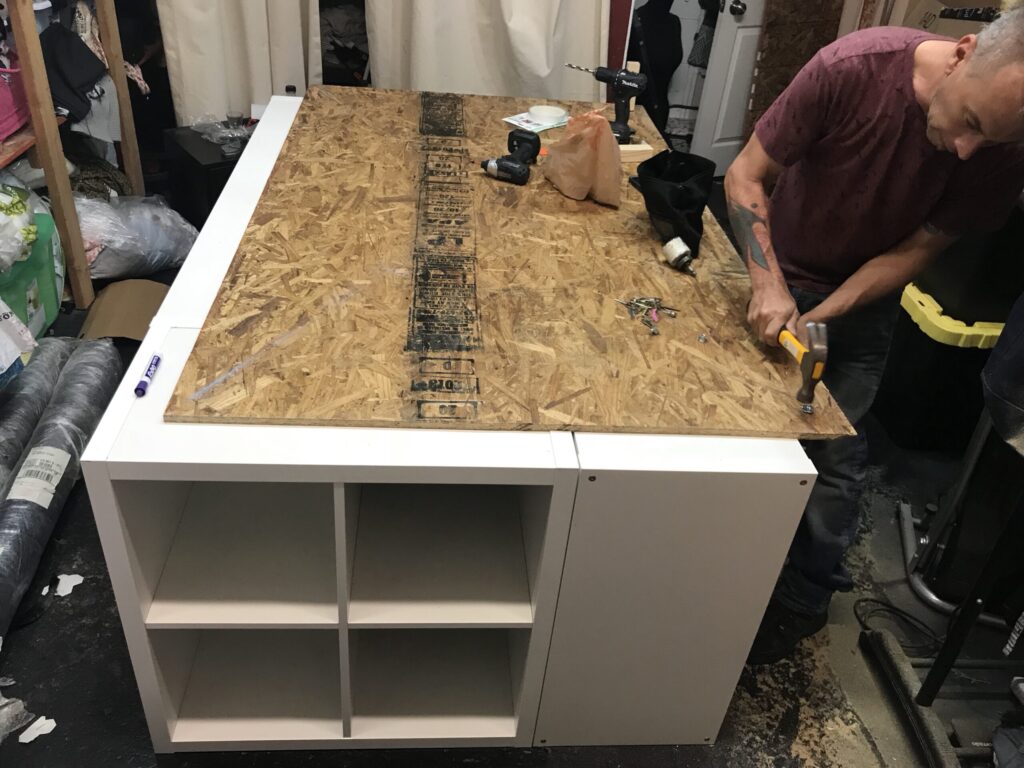 Another big issue is the table. It’s a great standing height but it has a weird curve in the one side and no storage underneath. I made do with it but I knew I needed something better. And I had just the partner to help me out…